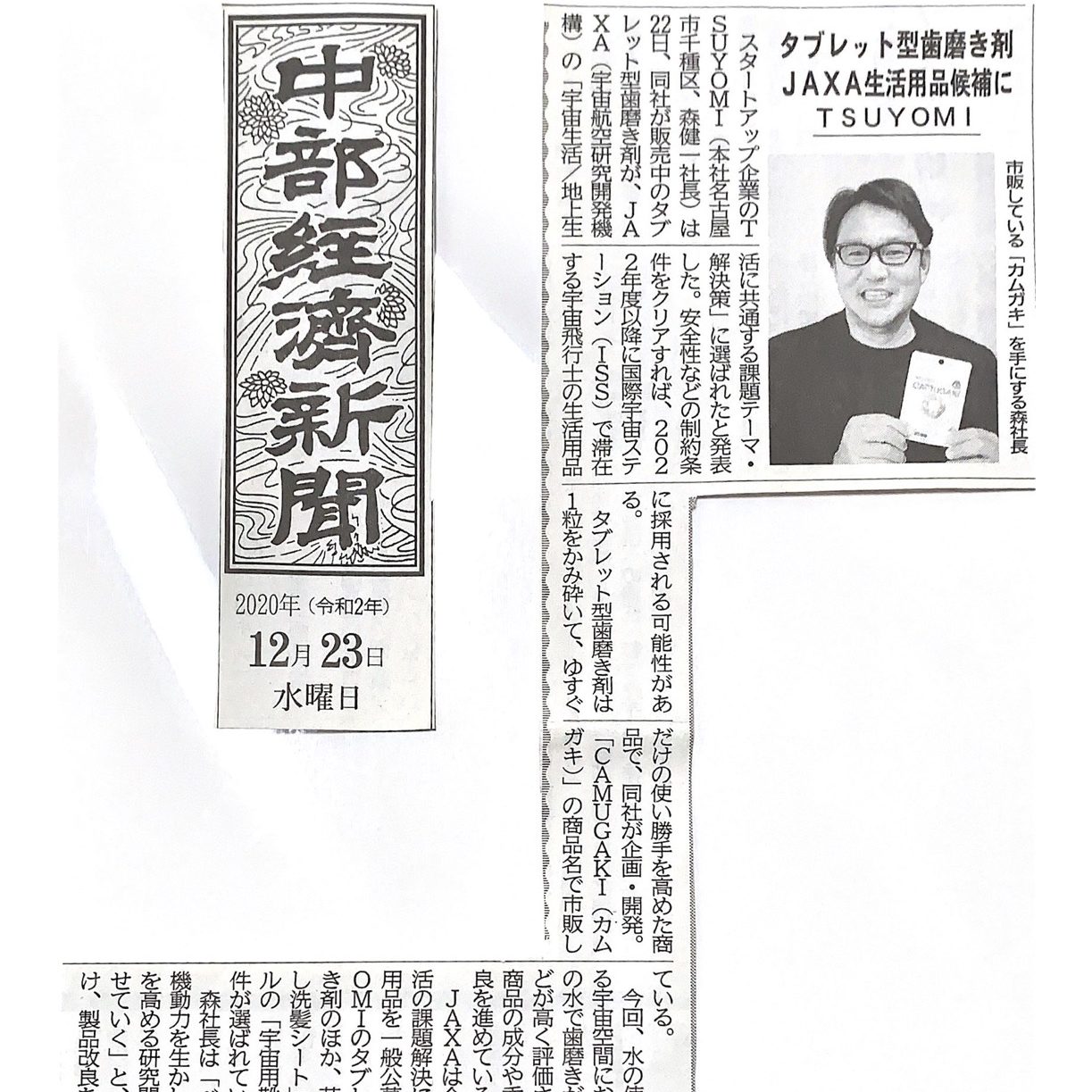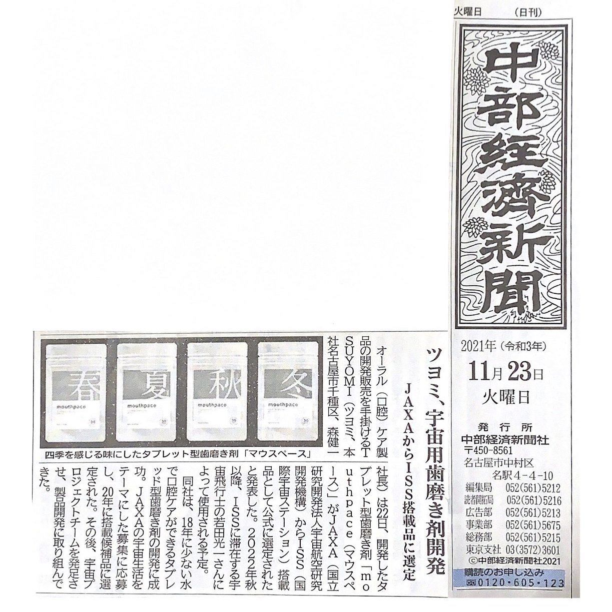 「中部経済新聞」にJAXA・国際宇宙ステーション(ISS)搭載候補品として選定について掲載していただきました。